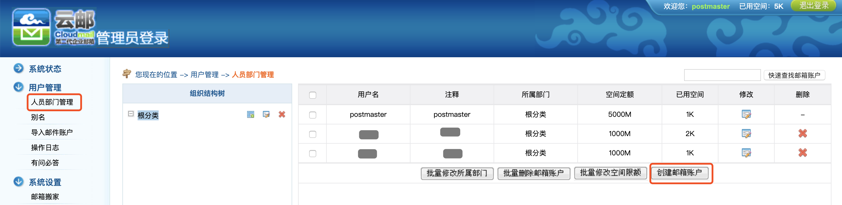 点击左侧菜单“人员部门管理”,再点击“创建邮箱账户”。