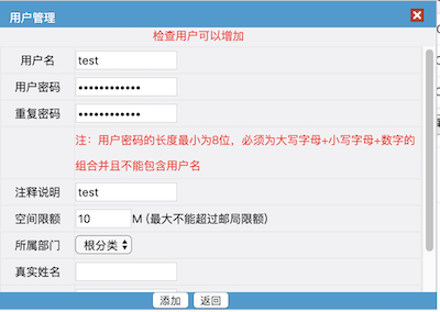填写用户名、用户密码、重复密码、空间限额,再点击添加。需要注意的是,用户密码的长度至少8位,且必须同时包含大写字母、小写字母、数字,并且不能包含用户名。