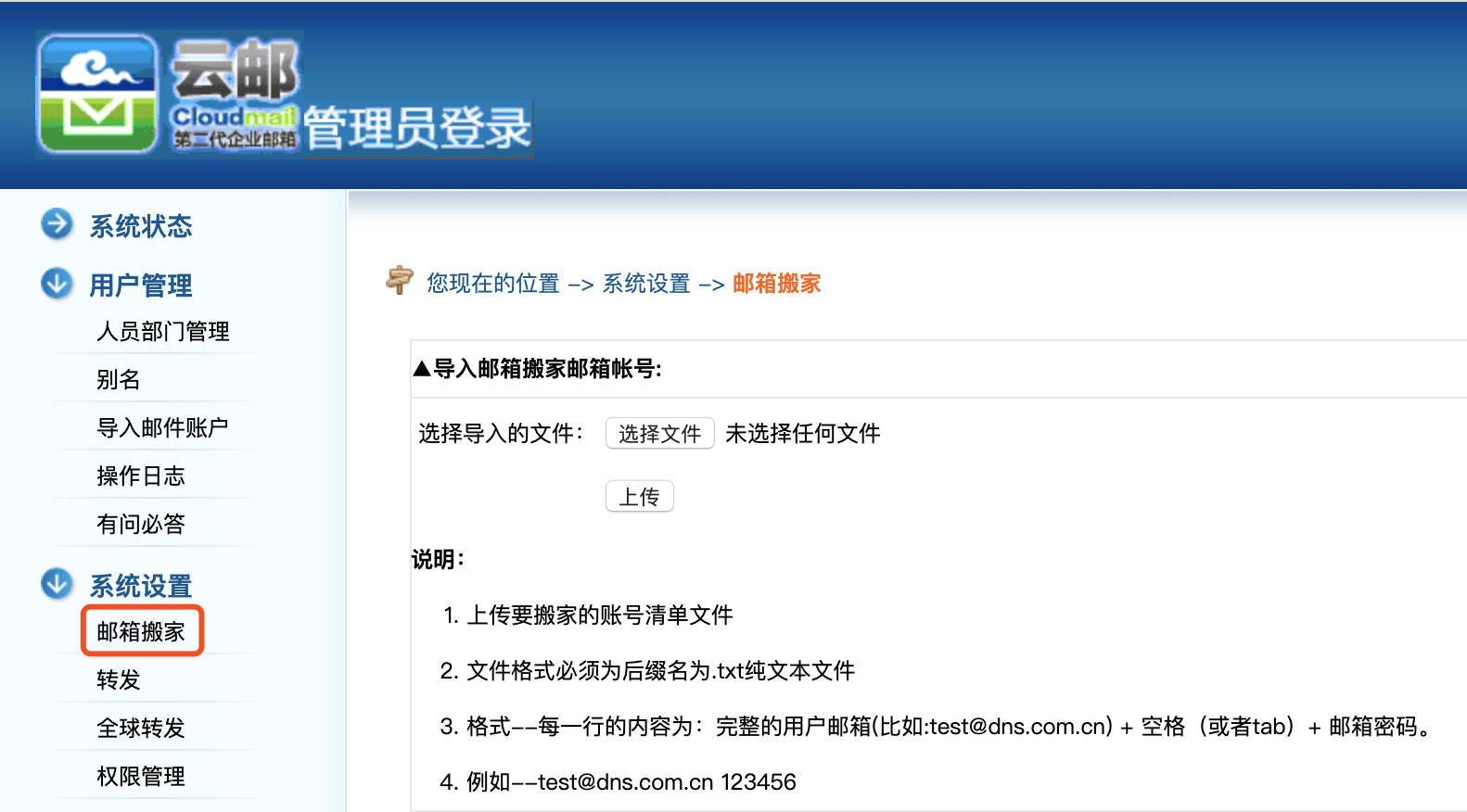 如果邮局用户比较多,也可以采用批量导入的方式。点击左侧菜单“邮箱搬家”,按照页面提示上传清单文件。