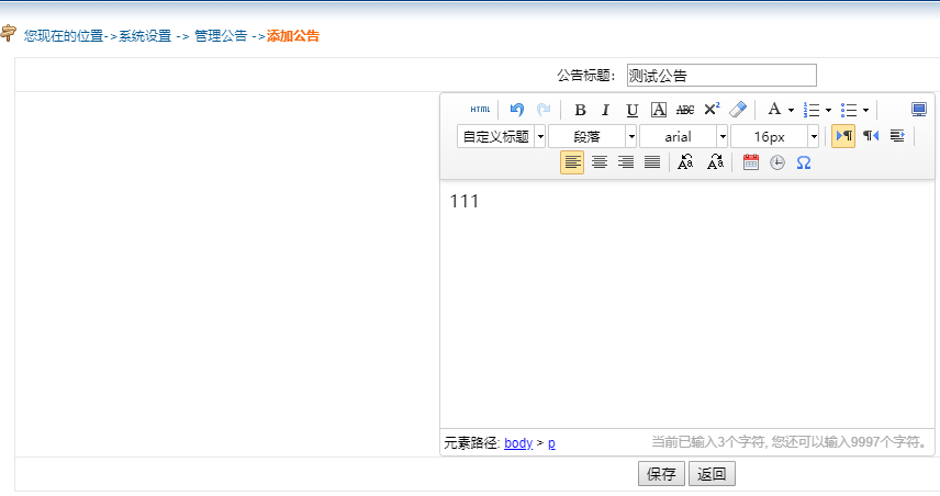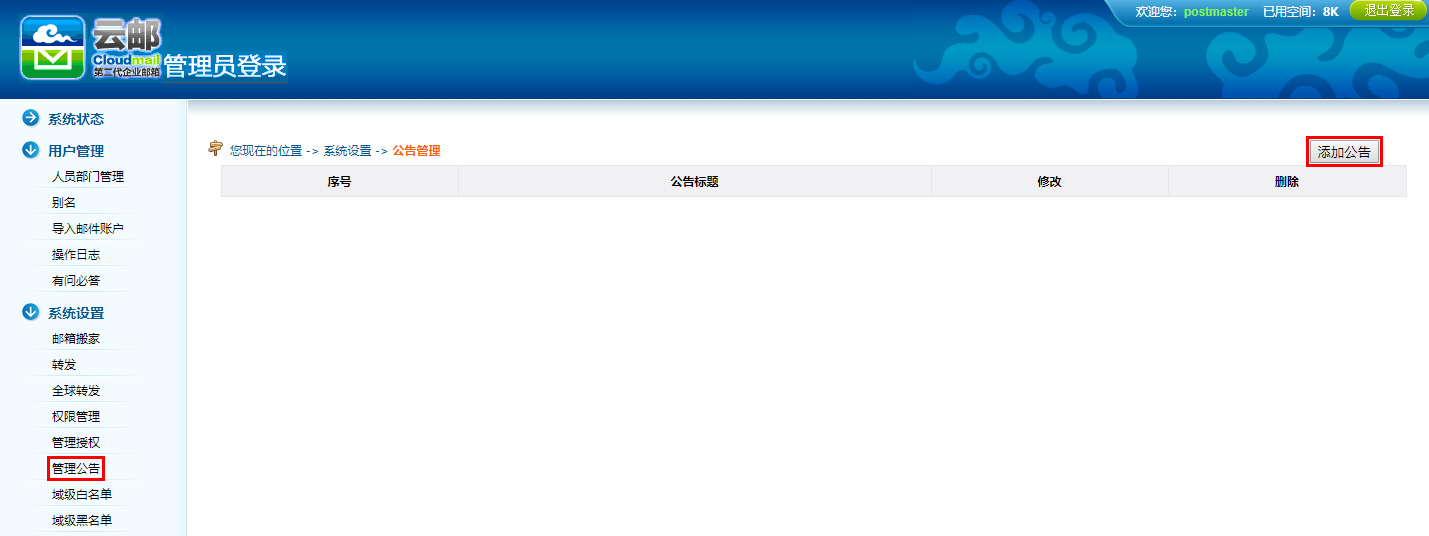 点击左侧菜单“管理公告”,再点击“添加公告”。