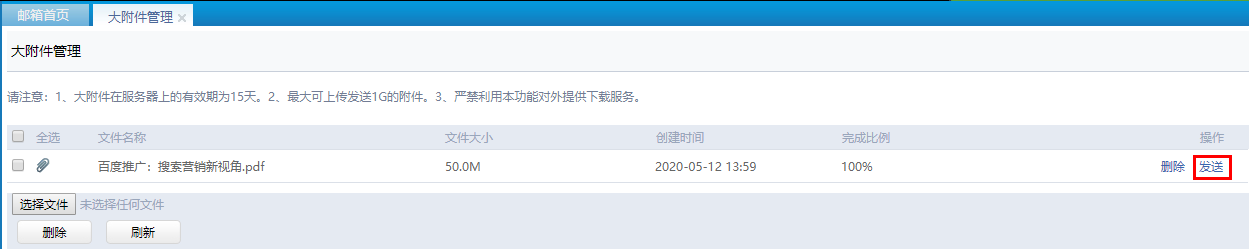 3、文件上传完毕后,点击“发送”链接,进入写邮件页面。