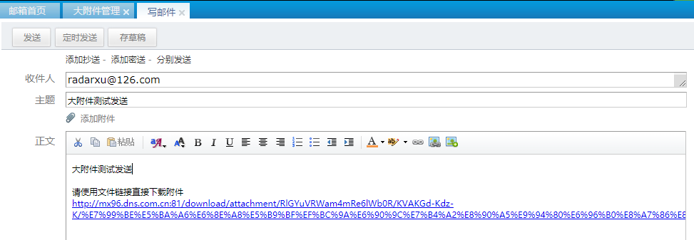 4、填写收件人、主题和正文。正文末尾会自动附上大附件的下载链接,这样对方收到邮件后,点击链接即可下载附件。