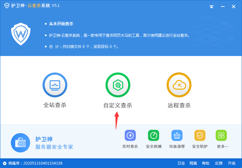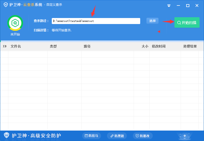 选择“自定义查杀”,选择站点所在路径 ,如下图 D:\wwwroot\testweb\wwwroot ,点击 “开始扫描”。