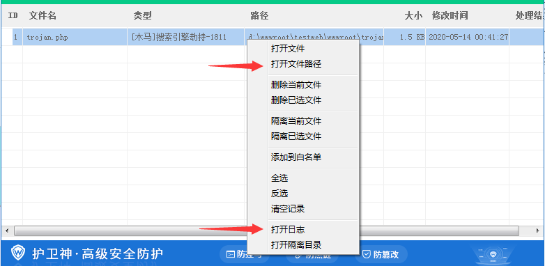另外,点击相关条目鼠标右键 ,参考下图可“打开文件路径”,“打开日志”以log格式文件查看操作记录,在确认为异常文件后可直接删除异常文件。