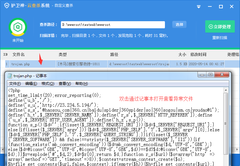 若存在异常挂马文件,则在下图列表会显示具体的文件名和挂马类型等信息,双击条目可查看具体挂马内容。