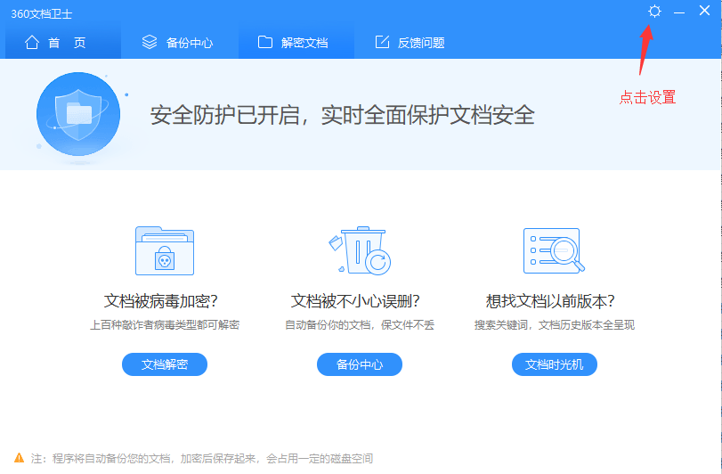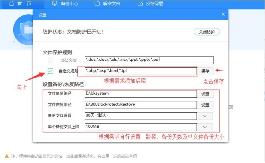 假如我们通过护卫神云查杀工具扫描出来php后缀的挂马文件。打开360文档卫士,点击设置 ,在自定义规则中添加 *.php 后缀格式 ,点击保存 。