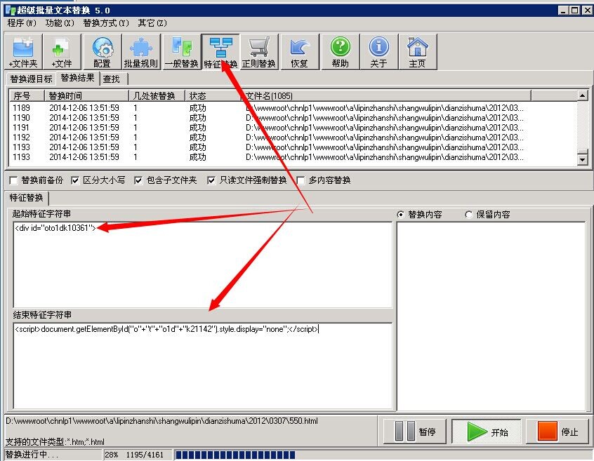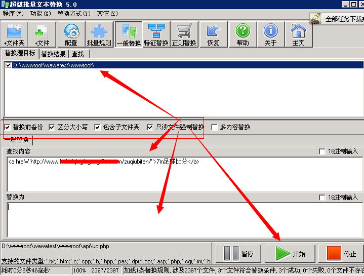 也有一些挂马是有特征的。以某一代码开始,另一代码结束,中间挂的连接是随机的,可用"特征替换"功能。