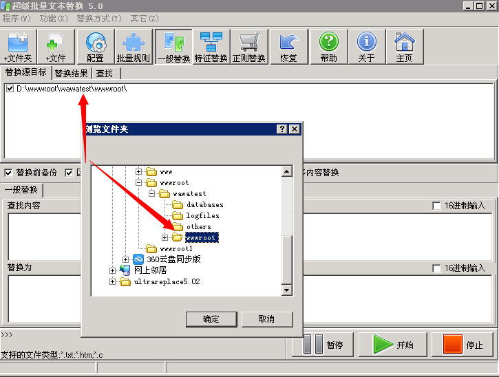 若替换单个文件,点击+文件,若是要批量替换某个目录下的字符串,则点击+文件夹。