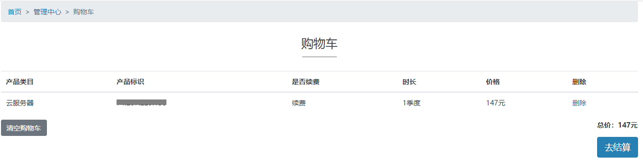 成功加入购物车后,在购物车页面会显示您续费的乐鱼全站app下载信息,包括IP地址、续费时长和价格。如果没有问题,点击“去结算”进入下一步。