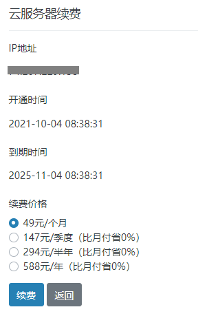 在乐鱼全站app下载续费页面,选择付款周期,可选月付、季付、半年付、年付四种方式。按小时付费无需手工续费,系统会自动从用户名下的余额中扣款。