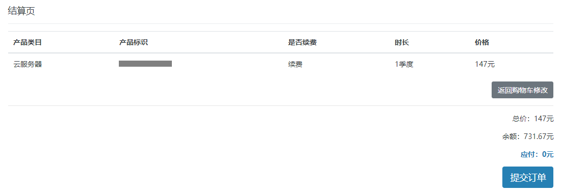 在结算页再次确认续费的产品信息,如果没有问题,点击“提交订单”,也可以“返回购物车修改”。